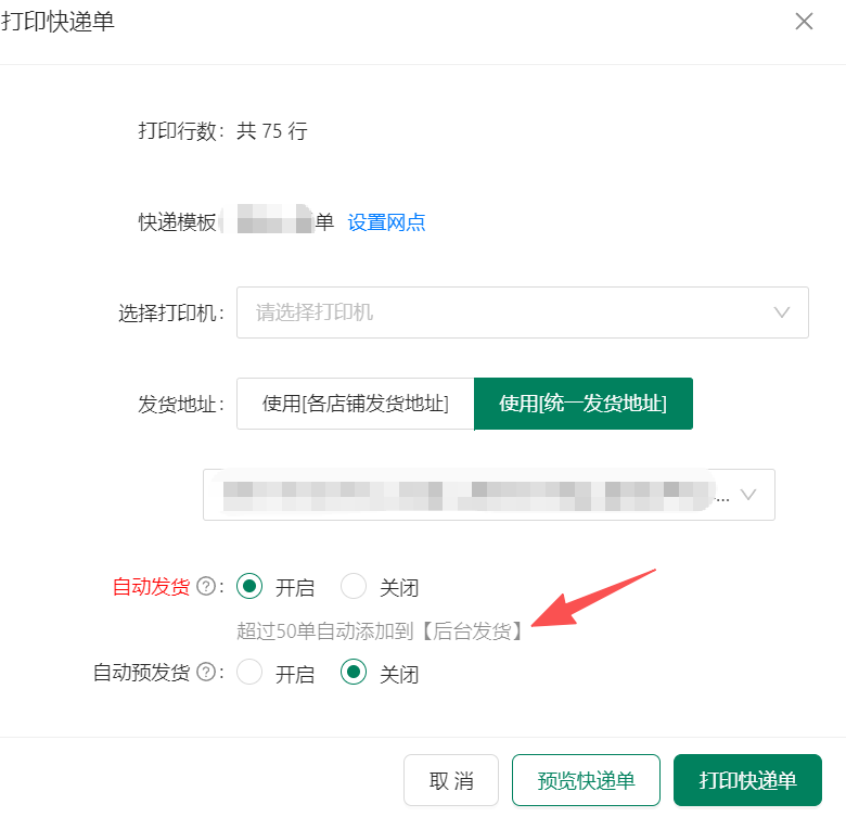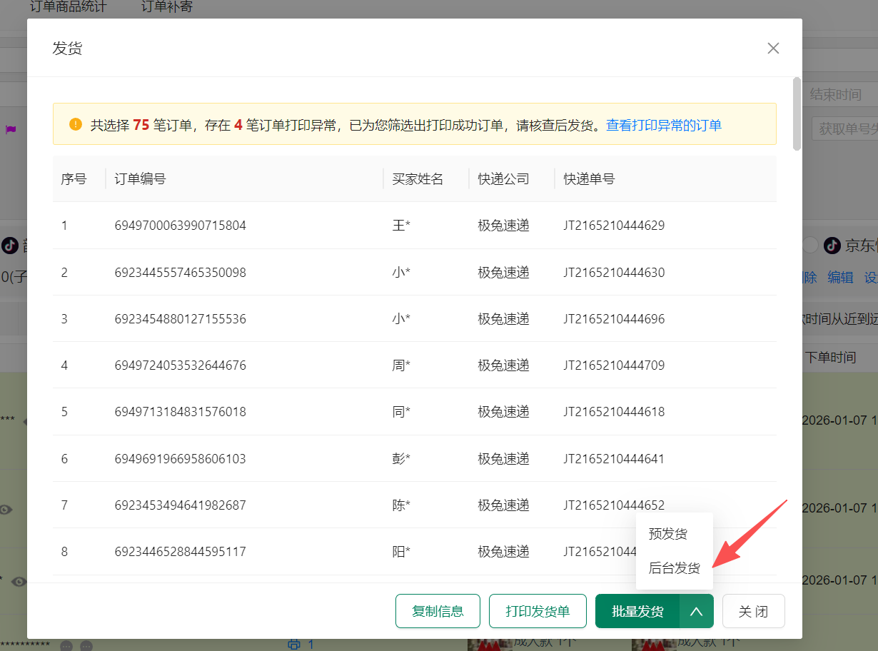 当您单次发货的订单数量超过 50 单时,系统会自动提示,选择“后台发货”模式。